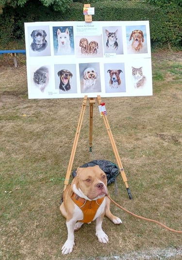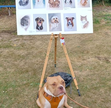 A small stand I had at a local dog show in Wheaton Aston showing some of my pet portraits. The staffy appreciated them so much he had to pose for the camera.